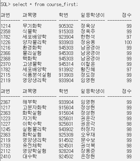 CREATE OR REPLACE VIEW course_first (과번, 과목명, 학번, 일등학생이름, 점수)