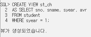 WHERE syear = 1; // 1학년 학생의 정보를 출력하는 view 생성. 단일 뷰.