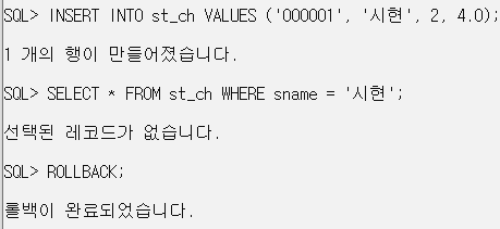 INSERT INTO st_ch VALUES ('000001', '시현', 2, 4.0); // 검색은 1학년만 되지만 2학년의 정보 입력은 가능하다.