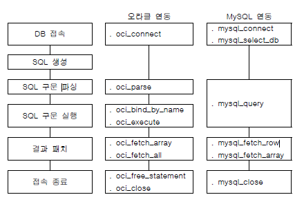 RDBMS를 이용하기 위해서는 일단 DB에 접속해야 한다. 사용자가 mysql이나 sqlplus와 같은 클라이언트 프로그램으로 DB에 접속하는 것과 같이 PHP는 mysql_connect나 oci_connect등의 함수를 이용해 DB에 접속한다.