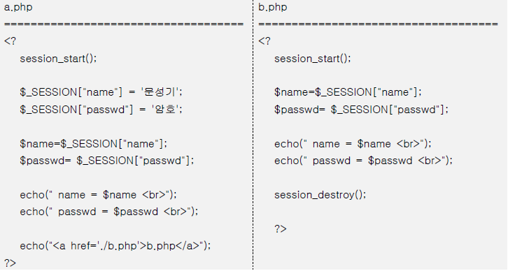 세션을 사용하려면 파일의 첫 시작 부분에 session_start();를 써준다. php.ini에 session.auto_start를 1로 설정하면 session_start()를 생략할 수 있지만 사용하는 경우는 잘 없다. session_destroy()함수가 호출되기