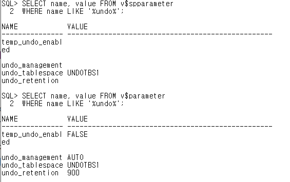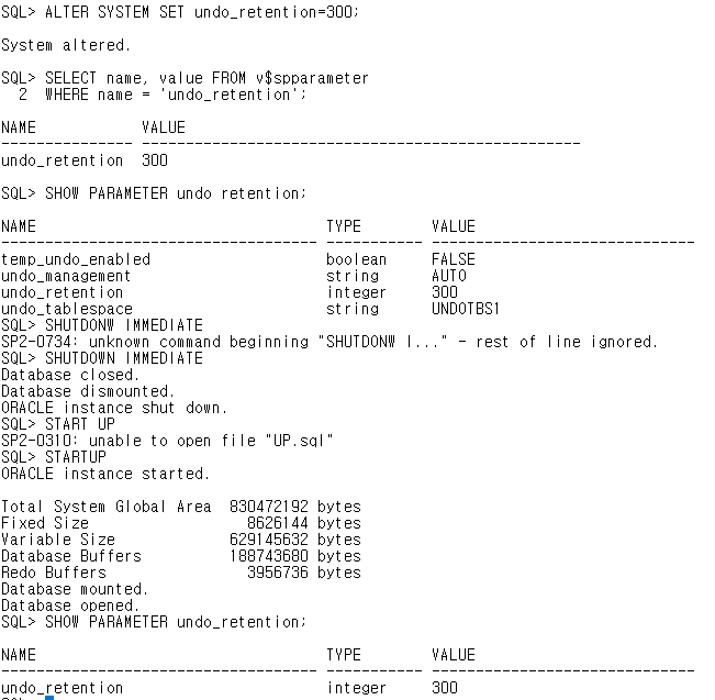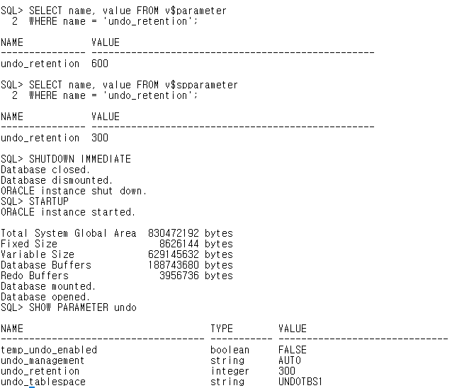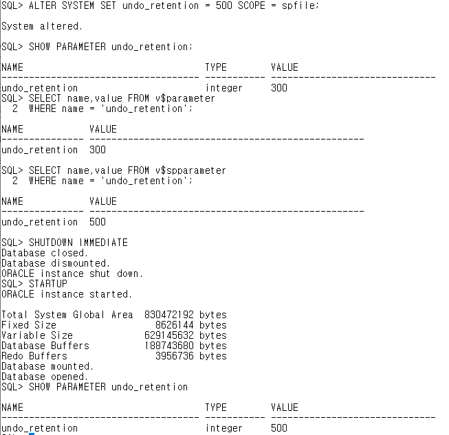 undo_retention 파라미터의 값을 수정하고 데이터베이스를 다시 시작해도 변화된 값이 유지되는 것을 확인할 수 있다.