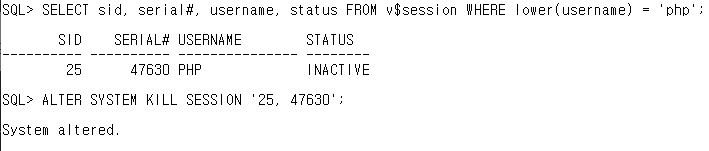 SQL> ALTER SYSTEM KILL SESSION <'SID번호, SERIAL번호'>;