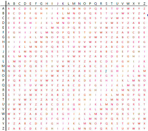 표의 가로줄은 평문, 세로줄 : 키, 두 개가 일치 하는 빨간색 글자가 암호문이다.