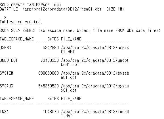 -> 테이블 스페이스 insa라는 이름을 가지는 테이블 생성 명령