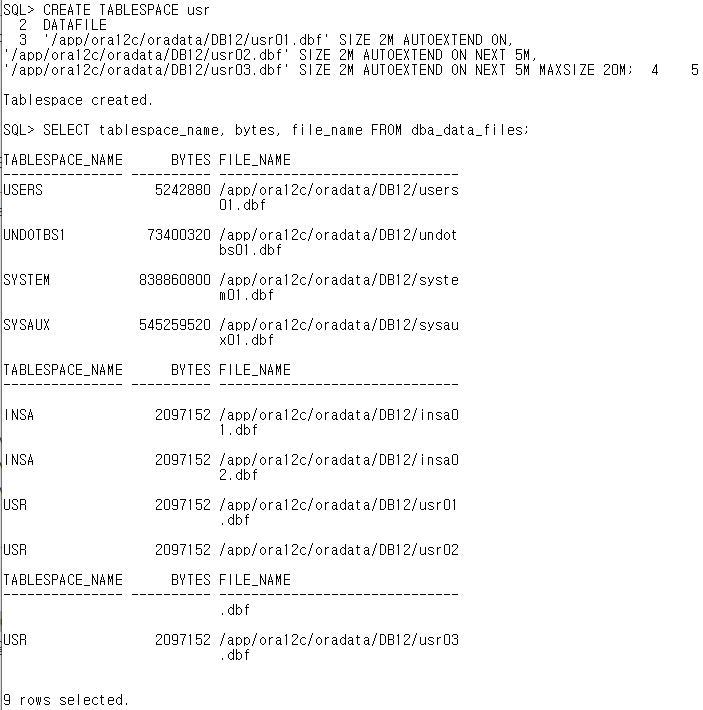 '/app/ora12c/oradata/DB12/usr03.dbf' SIZE 2M AUTOEXTEND ON NEXT 5M MAXSIZE 20M;
