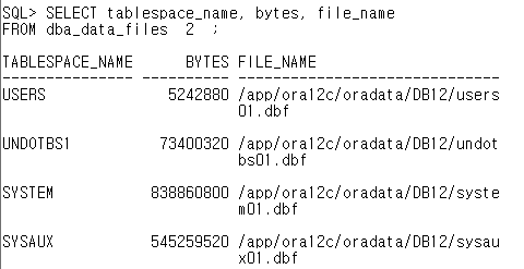 SELECT tablespace_name, bytes, file_name FROM dba_data_files;