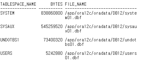 SELECT tablespace_name, bytes, file_name