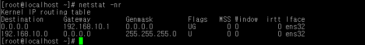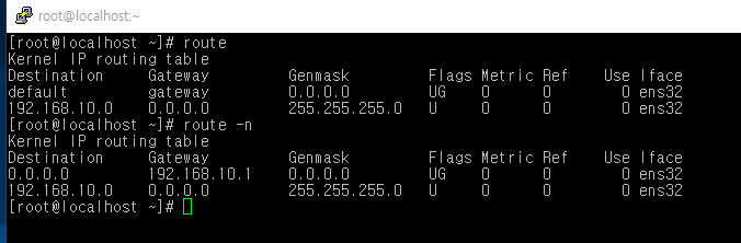 - Genmask : 대상의 netmask. 255.255.255.255는 호스트, 0.0.0.0은 디폴트 라우트를 의미 한다.