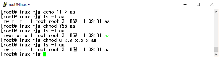 // aa 파일의 상세 정보 확인(퍼미션이 -rwxr-xr-x로 변경된 것을 확인할 수 있음)