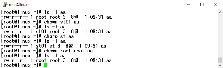 // aa 파일의 소유자와 그룹 소유자를 동시에 root로 변경(비표준 명령)