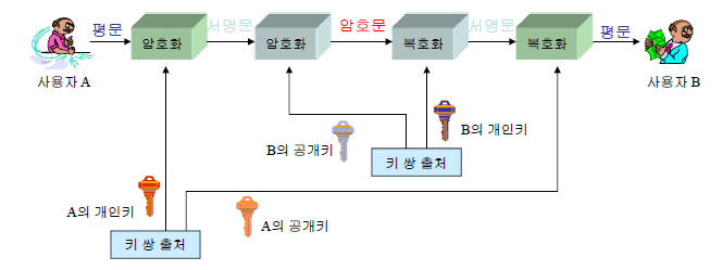 - 암호/복호(수신자의 공개키로 메시지 암호)