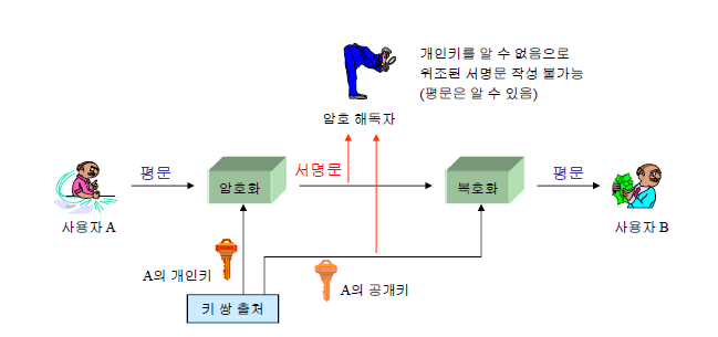 - 개인키로 암호화된 문서를 암호문보다는 서명문이라고 부른다.