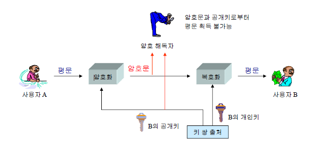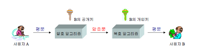 - 두 개의 키중 하나는 인터넷에 공개(공개키), 하나는 자신만이 소유(개인키)