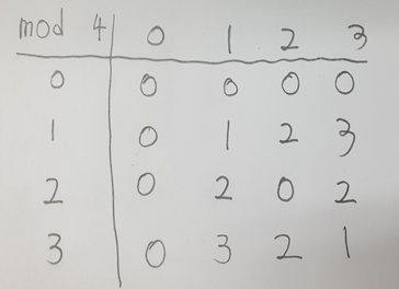 - mod 5는 행과 열에 모든 잉여계가 존재하고 mod4는 행과 열에 모든 잉여계가 존재하지 않는다.