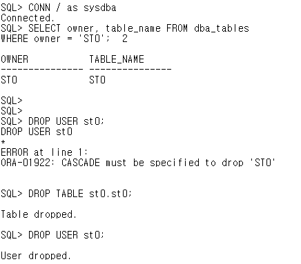 - 오라클에 현재 연결되어 있는 사용자는 삭제할 수 없다.