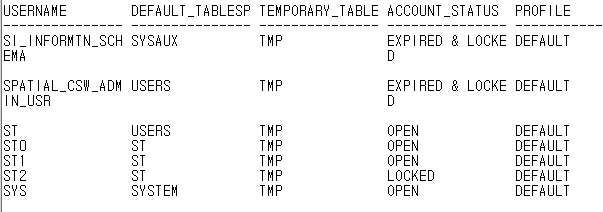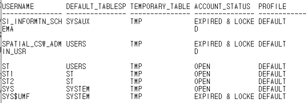 SELECT username, default_tablespace, temporary_tablespace, account_status, profile