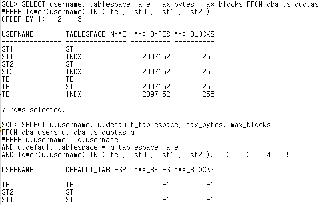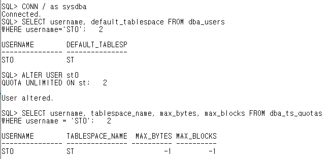 // 사용자들의 default 테이블 스페이스별 quota량이 unlimited로 지정된 것을 확인