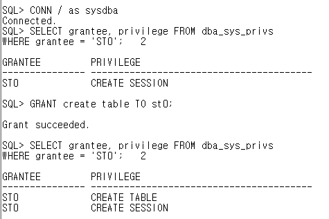 // st0의 시스템 권한을 조회. CREATE TABLE이 추가된 것을 확인