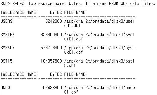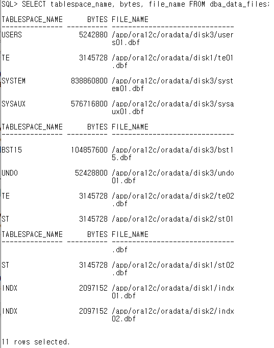 SELECT tablespace_name, bytes, file_name FROM dba_data_files;