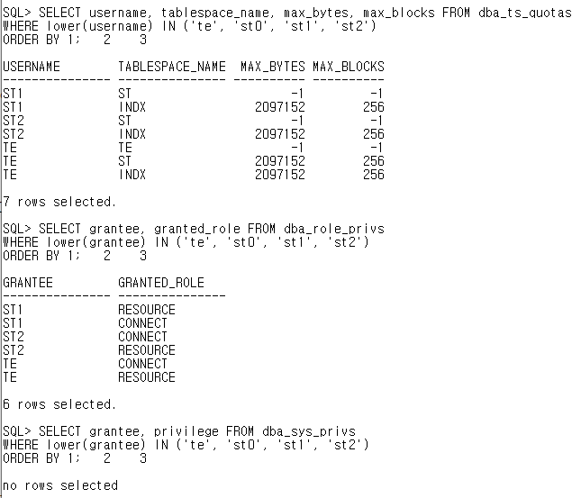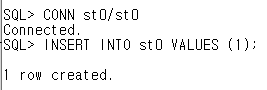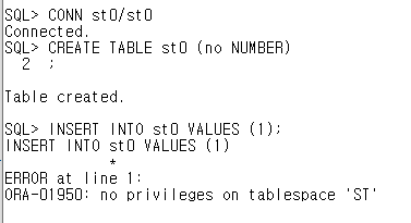 // st0가 default 테이블 스페이스에 quota가 없어서 입력되지 않는다