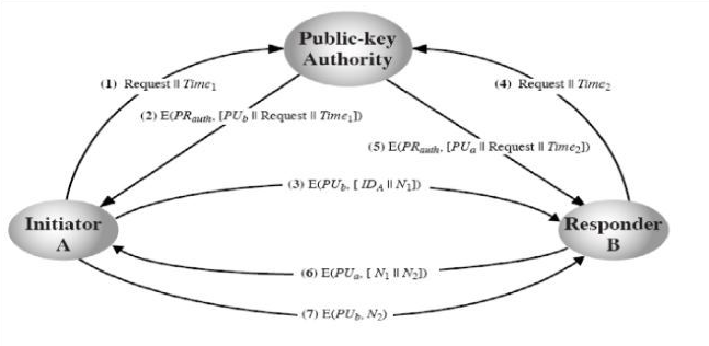 (7) E(PUb[N2]) : A가 개인키로 암호문을 푼뒤 B의 공개키로 N2암호화해서 B에게 보낸다.(자신이 A임을 증명)