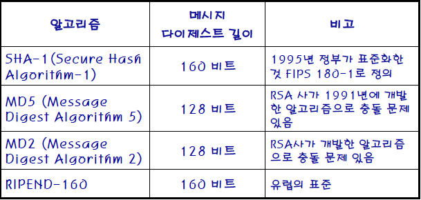 - SHA-1의 메시지 다이제스트 길이인 160비트는 통상적으로 길다고 판단되어 사용하지 않는다.