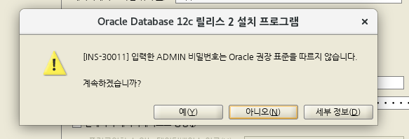 - 비밀번호의 권장 표준 같은 경우 무시하고 '예'를 클릭.