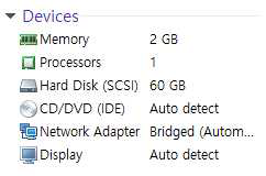 - 다음의 사양으로 VMware에 CentOS7을 설치.