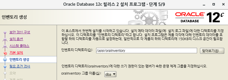 - ora12c가 dba 그룹이기때문에 orainventory 그룹 이름도 자동으로 생성