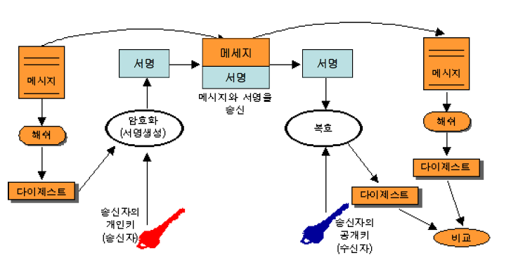 4. 수신자는 송신자의 공개키로 서명문을 복호화한 다이제스트와 메시지를 함수화한 다이제스트가 같은지 비교