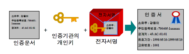 - 인증서라 함은 개인키와 이에 합치하는 공개키에 대하여 이를 소유하는 자연인 또는 법인과의 귀속관계 등을 인증기관이 자신의 개인키로 전자서명하여 확인, 증명하는 전자적 정보
