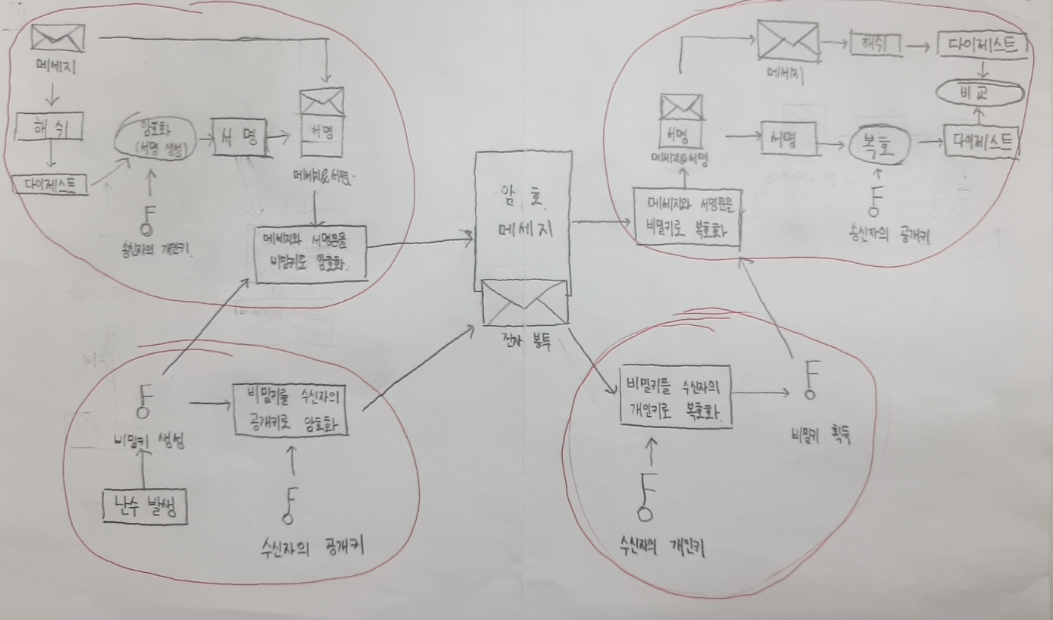 - 현재 사용 하는 전자봉투 기법은 이렇게 메세지 부가형 전자서명과 기존의 전자봉투 기법을 합쳐서 사용