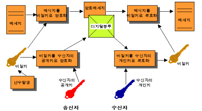 - 암호는 대칭키를 이용하고 대칭키는 공개키로 암호화