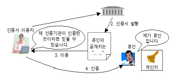 - 인증서를 발행하기 위해서는 공개키의 소유주는 인증기관에 공개키를 등록하고 인증기관은 등록된 개인의 공개키 자신의 개인키로 서명해서 인증서를 발행.