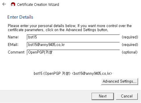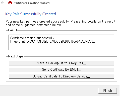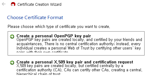 file -> new certificate -> Create a personal OpenPGP key Pair(OpenPGP 방식의 인증서 생성) 선택