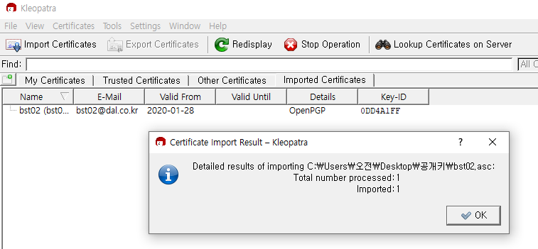 지정한 공개키가 imported certificates에 추가된 것을 확인